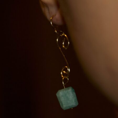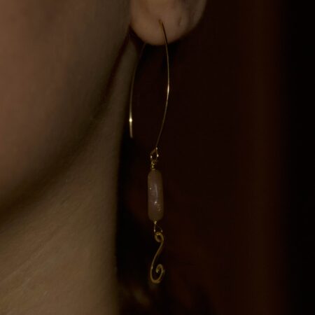 Un pendente sinuoso in metallo dorato che segue una linea morbida e organica, arricchito da una goccia di labradorite e da piccoli cristalli di quarzo rosa, ametista e acquamarina. Eleganza leggera, colori delicati, luce naturale.