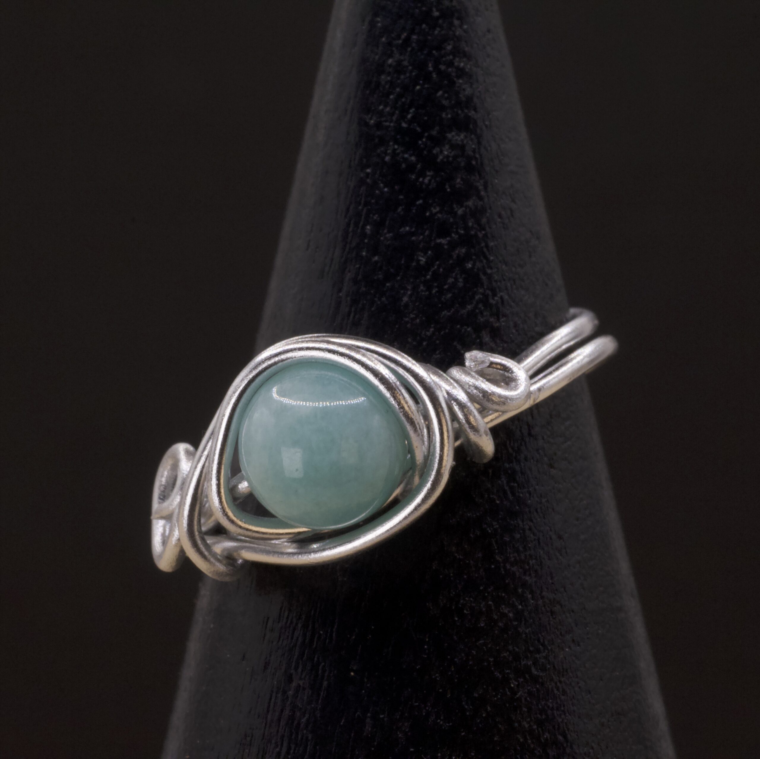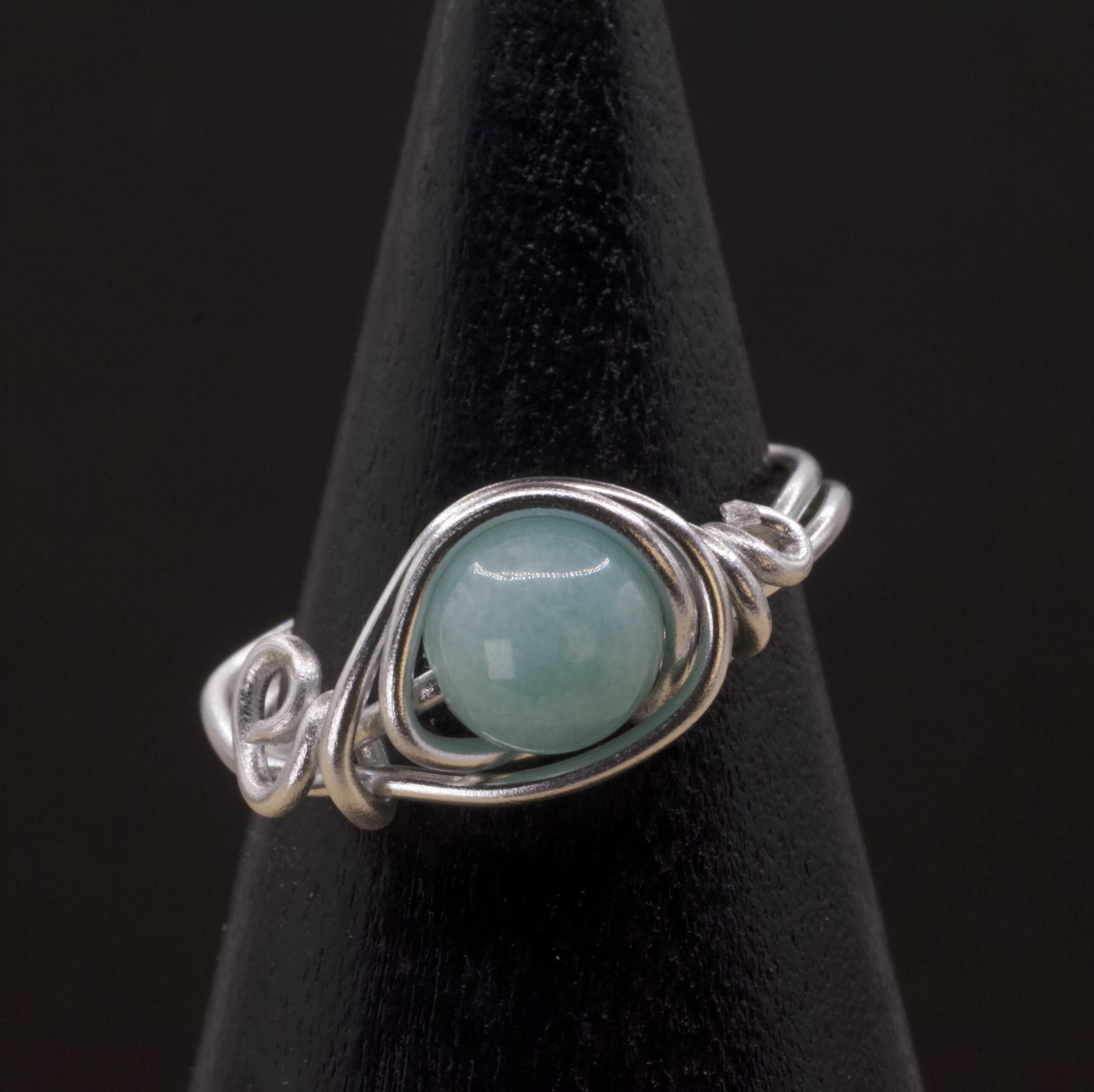Questo anello nasce da fili color argento che si avvolgono attorno all’amazzonite creando una piccola montatura intrecciata, compatta ma morbida nelle linee. La pietra, liscia e luminosa, ha un verde acqua delicato che si accende alla luce, senza risultare mai invadente.