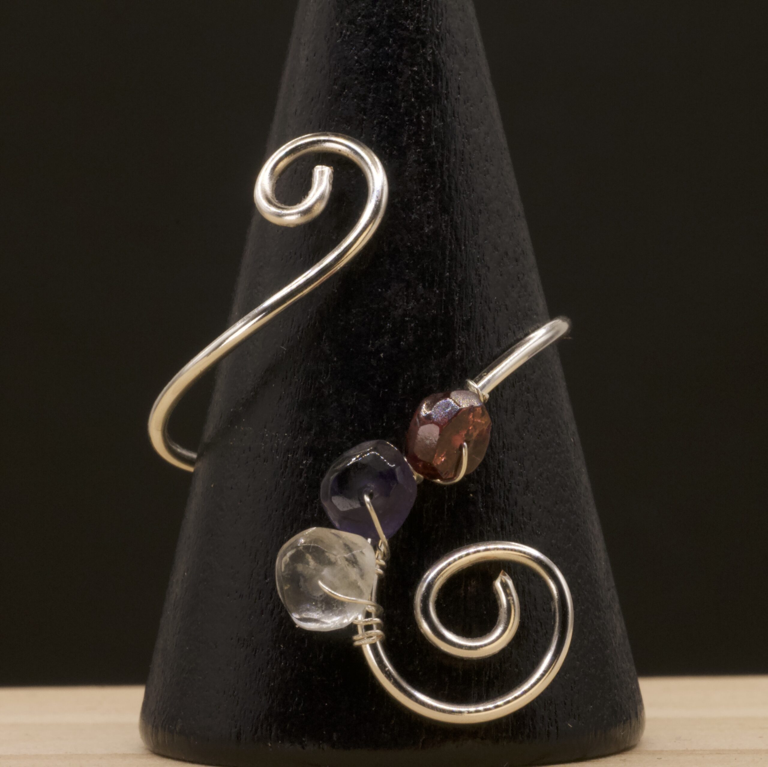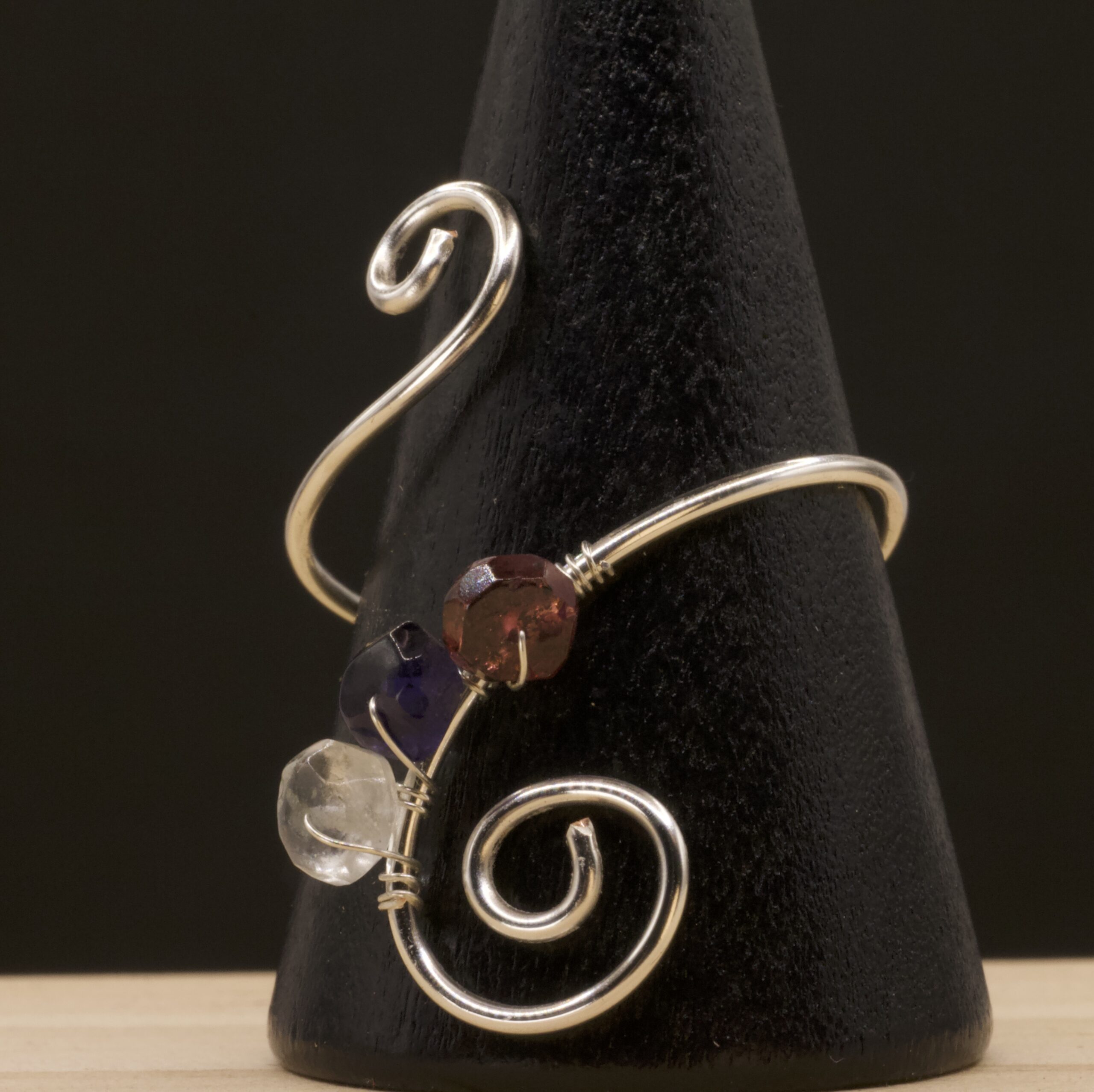Questo anello nasce da un filo di rame placcato argento 925 modellato in una spirale aperta che avvolge il dito con linee morbide. Sulla curva frontale sono fissate tre pietre naturali sfaccettate: il rosso intenso del granato, il viola profondo dell’ametista e la trasparenza del quarzo ialino.