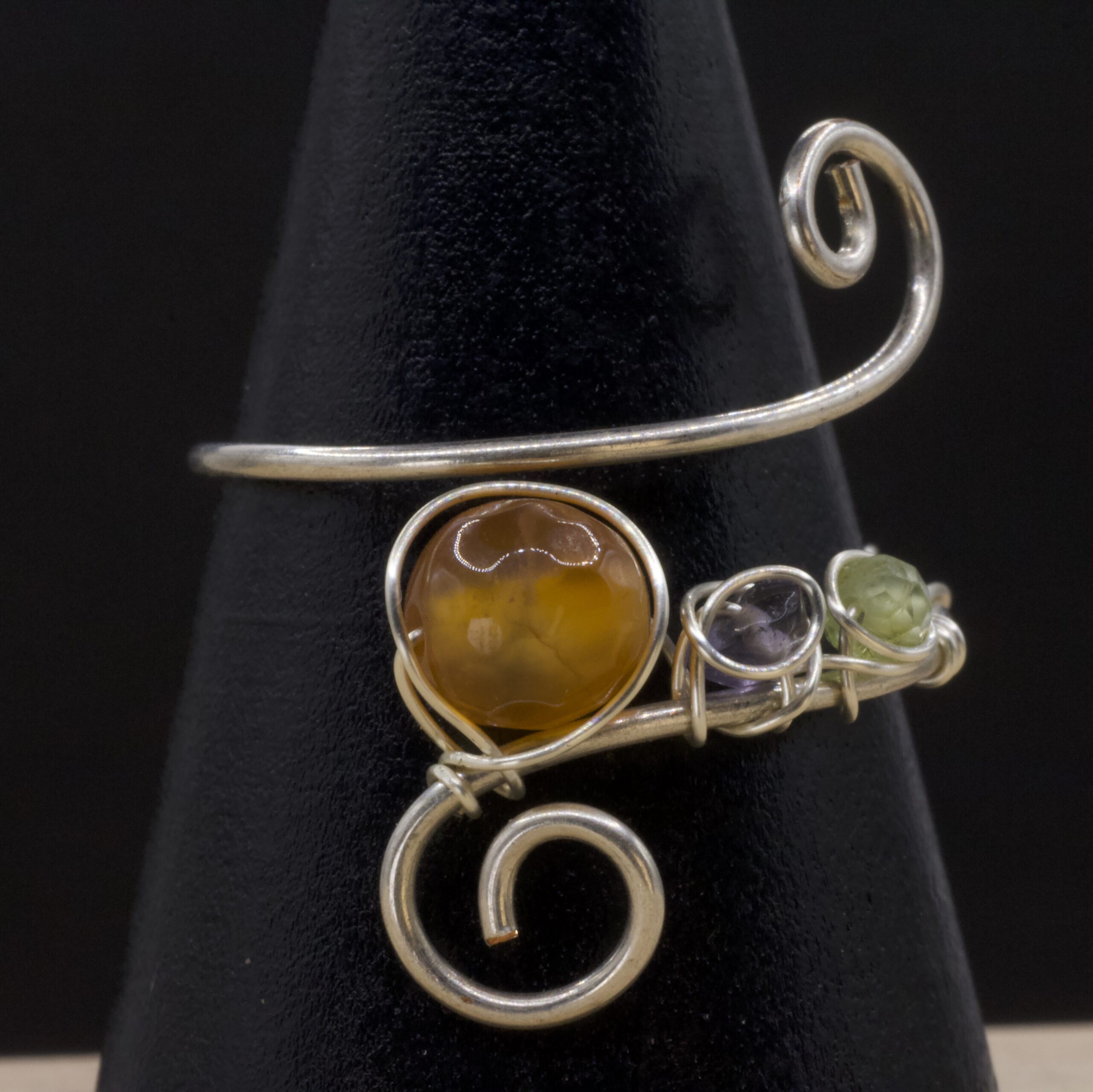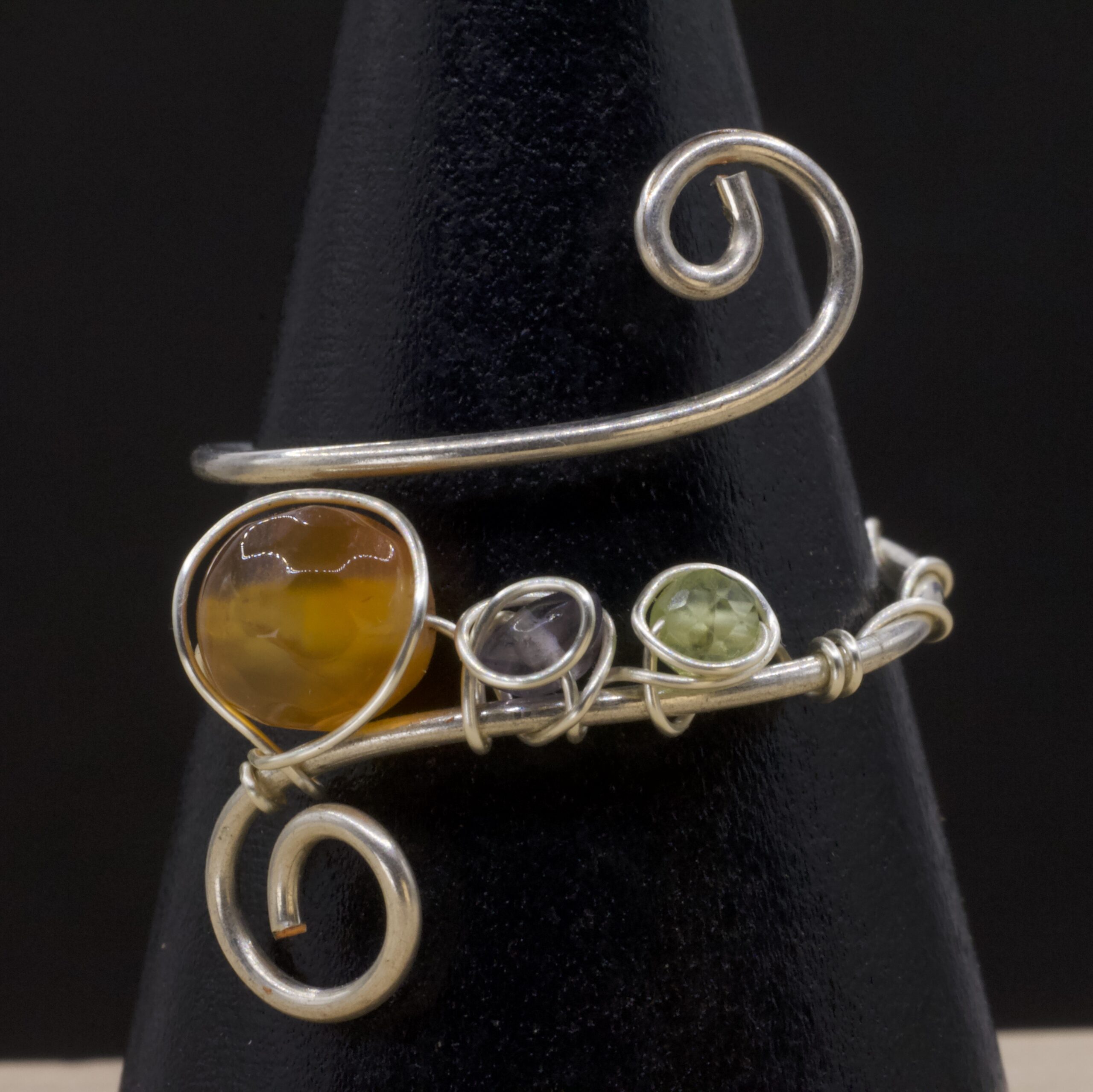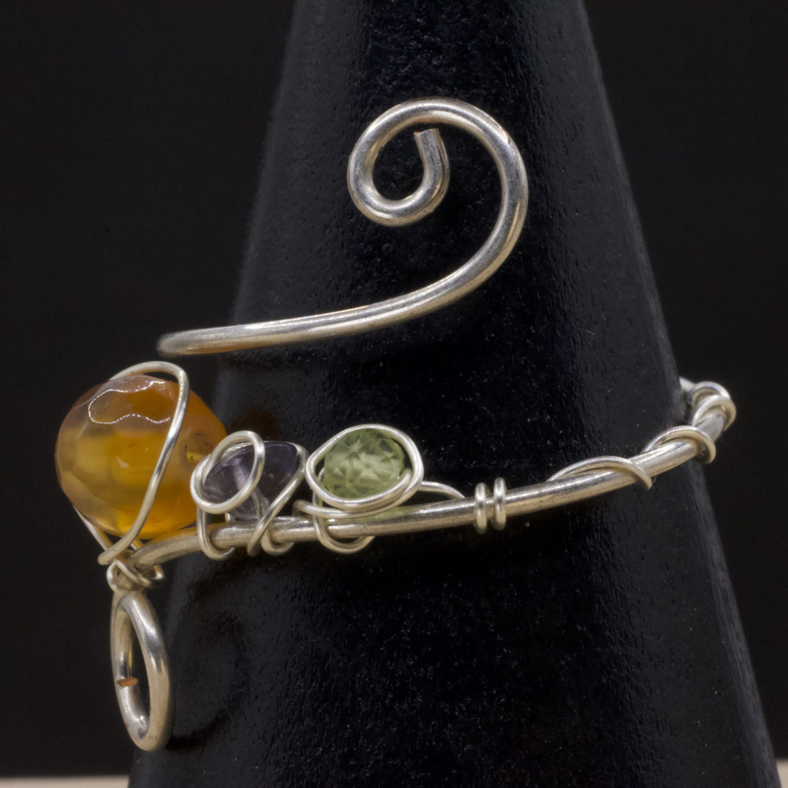 Questo anello nasce da un filo di rame placcato argento 925 modellato in una spirale aperta che abbraccia il dito con linee morbide. Al centro, una sfera sfaccettata di corniola sprigiona riflessi caldi, tra l’arancio e il miele; accanto a lei, una piccola tanzanite violacea e un peridoto verde chiaro aggiungono profondità e contrasto.