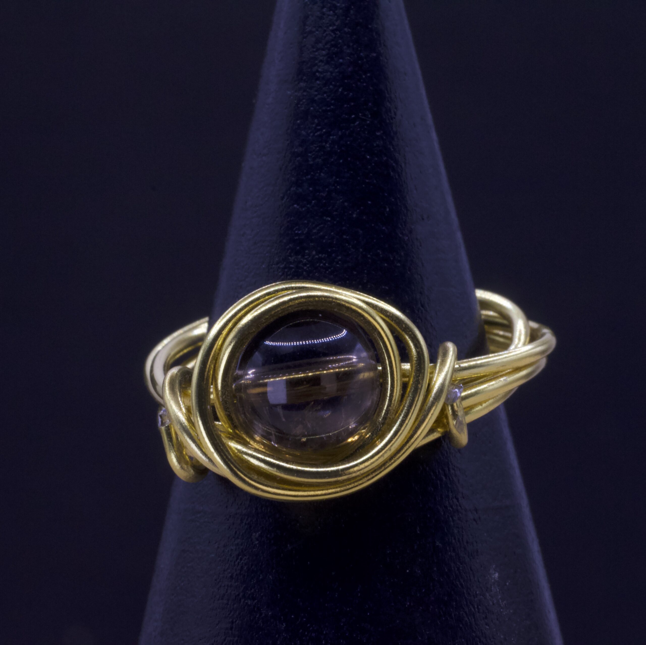 In questo anello il filo oro si avvolge attorno al quarzo fumé creando un piccolo cerchio protettivo: l’intreccio è pulito, compatto, studiato per far risaltare la pietra senza appesantirla. Il quarzo fumé, con il suo marrone trasparente e fumoso, riflette la luce in modo sottile, quasi ipnotico, come se custodisse una piccola bruma interna.