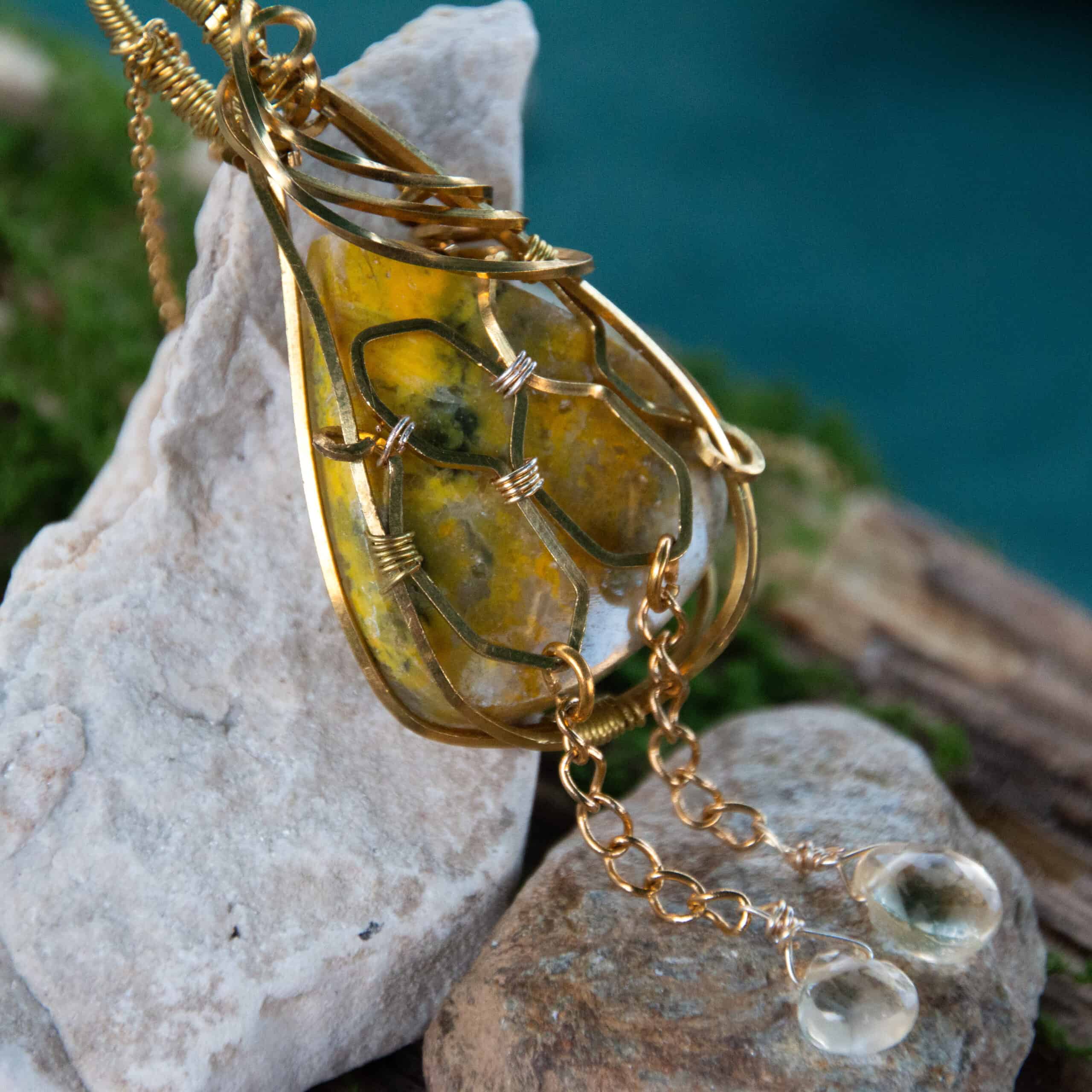 Un omaggio al bumblebee, custode operoso dei fiori e simbolo di comunità e vitalità. Il design di questa collana richiama le celle esagonali del miele e custodisce un cuore solare in diaspro bumblebee, una pietra rara e potente. Le due gocce mobili in quarzo citrino, leggere e dorate, scivolano come stille di miele puro.