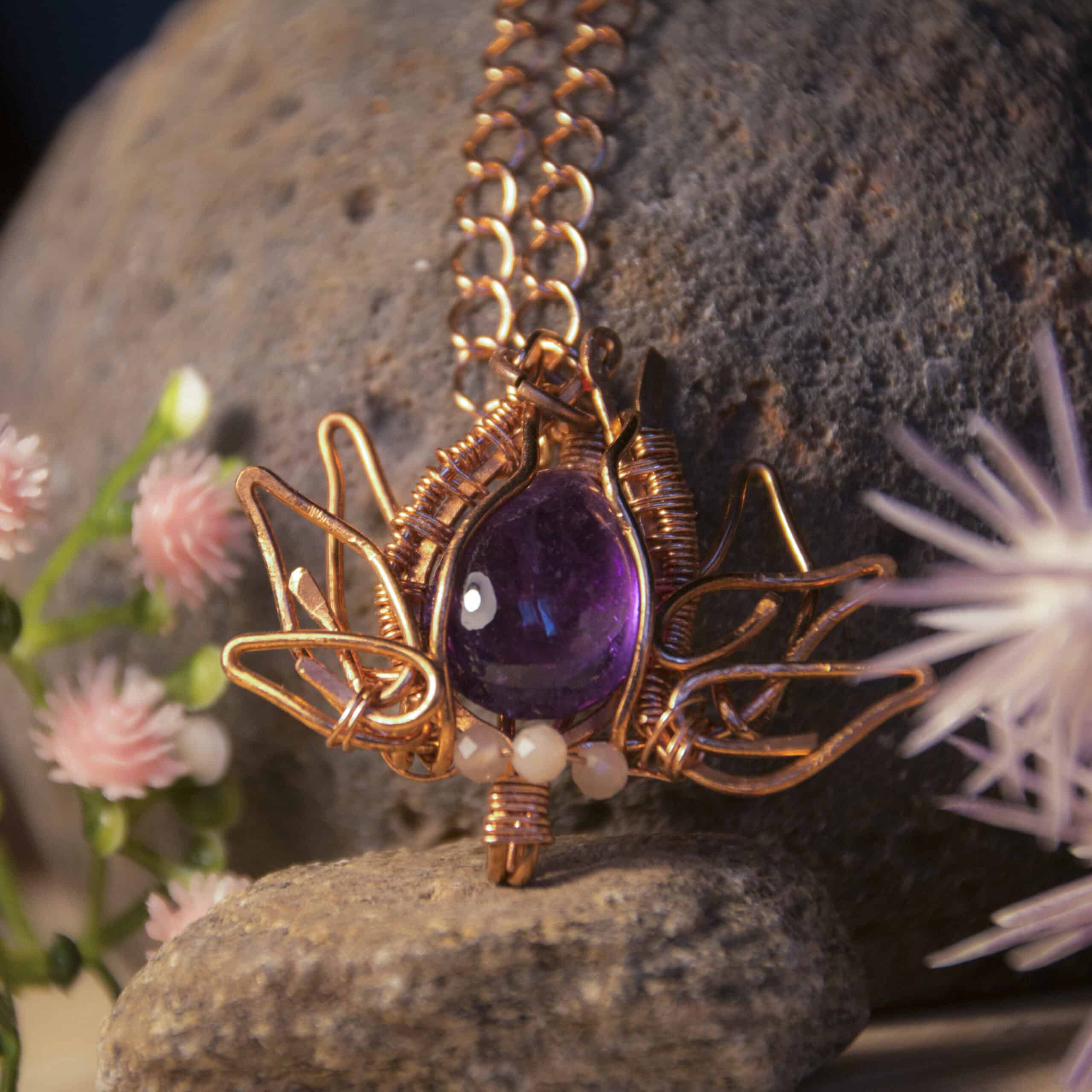 Una goccia d’ametista abbracciata da ali di rame e petali intrecciati, con piccole adularie come rugiada. Questa collana evoca rinascita, saggezza e visione interiore.