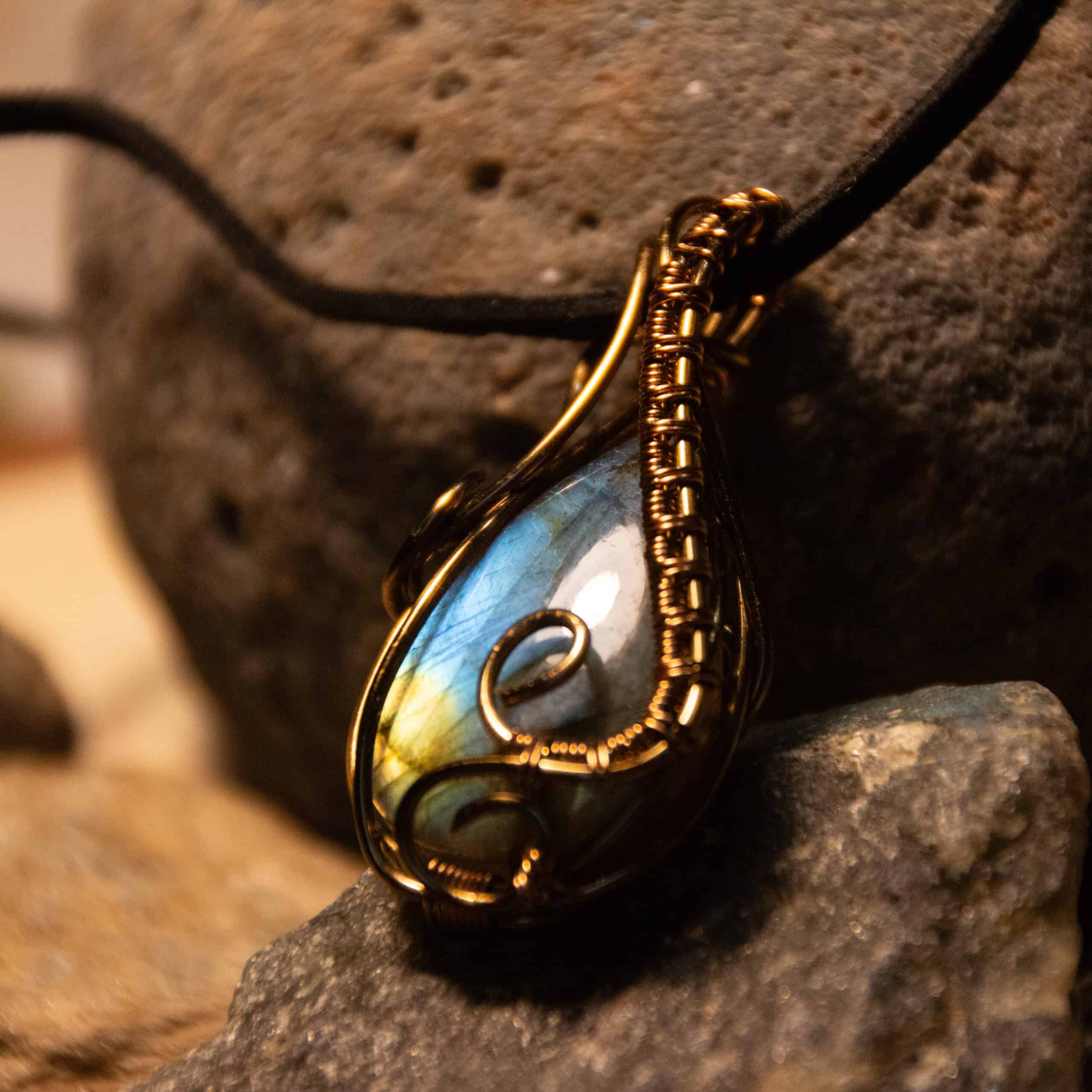 La labradorite, conosciuta come pietra dello sciamano e della trasformazione, è qui incastonata in un intreccio di rame brunito, che ne amplifica il potere e le sfumature cangianti.