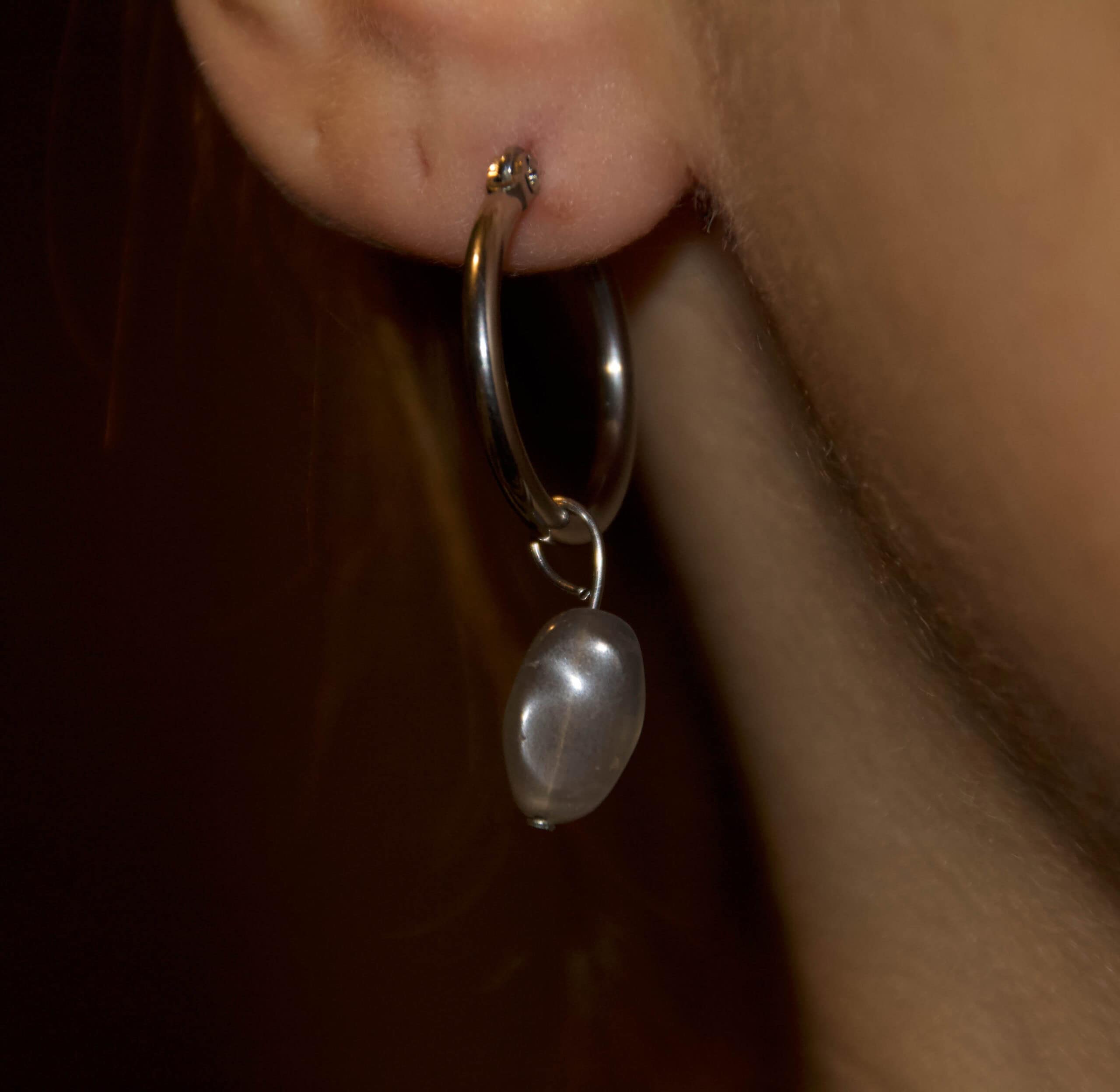 Questi orecchini mettono in risalto la bellezza discreta della pietra di luna nera, qui proposta in una forma levigata e morbida che riflette la luce con un bagliore sottile. Le tonalità grigio-fumo e nere, attraversate da venature chiare, rendono la pietra particolarmente sofisticata e versatile.