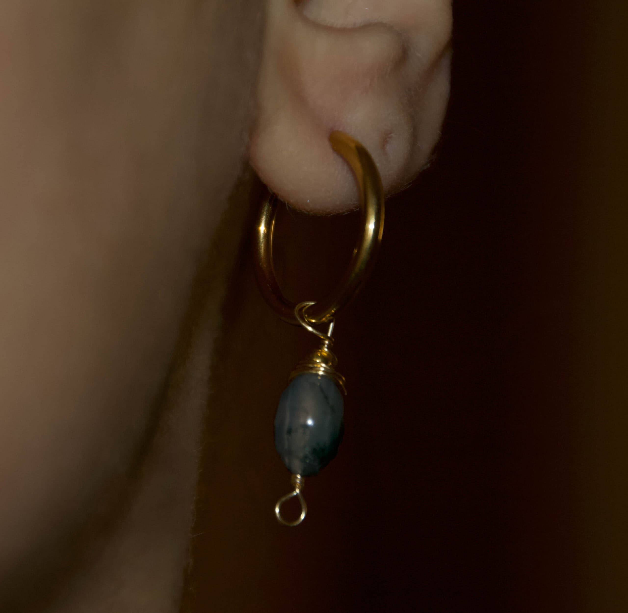 Questi orecchini mettono al centro l’agata muschiata nella sua forma più autentica: una piccola goccia levigata, caratterizzata da inclusioni verdi e grigie che ricordano trame naturali e morbide. Il cerchio dorato crea un contrasto caldo e luminoso, mantenendo il design minimal e pulito.