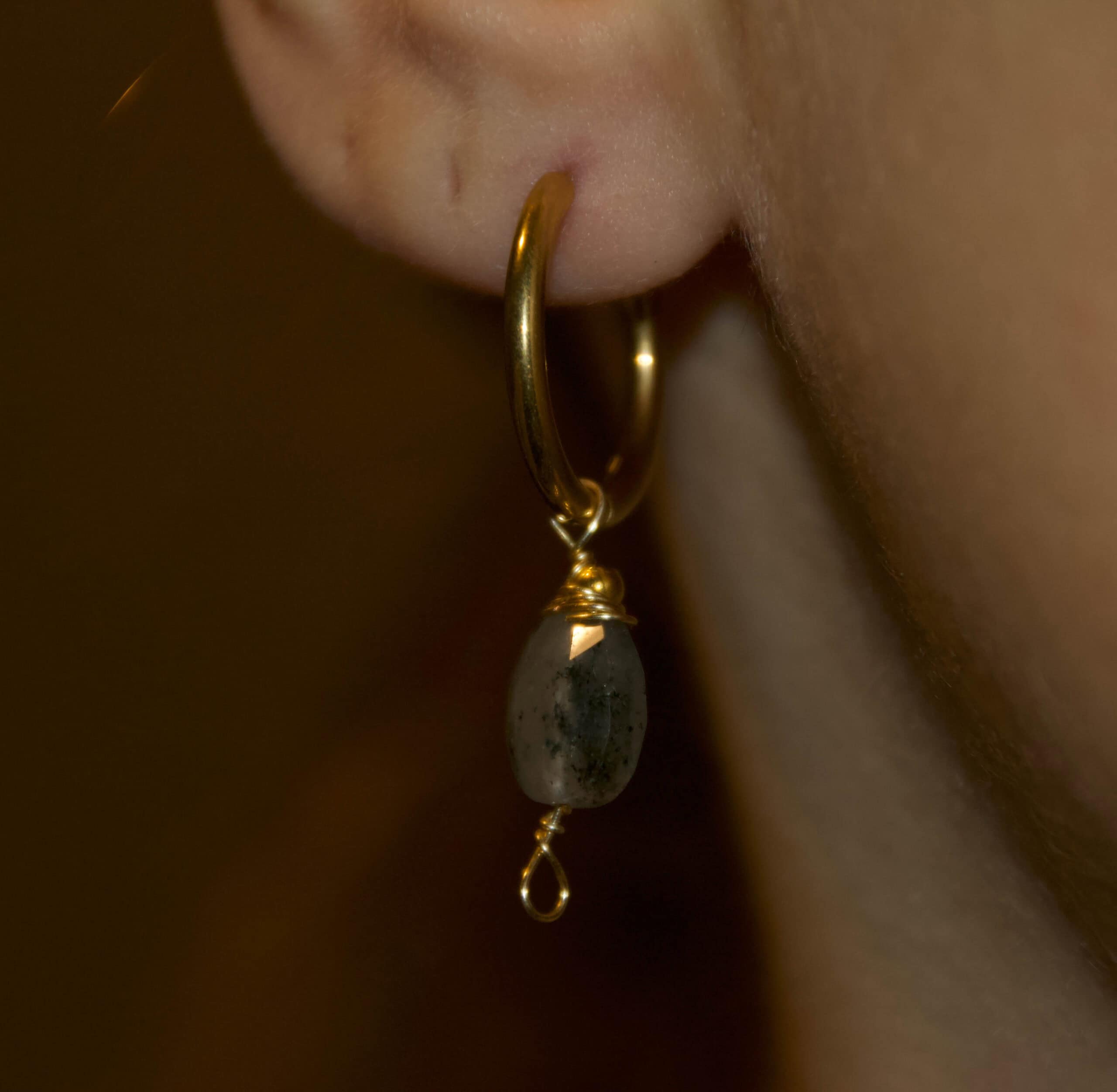 Una goccia di agata muschiata con inclusioni naturali, appesa a un cerchio dorato che illumina e valorizza le sue sfumature organiche.