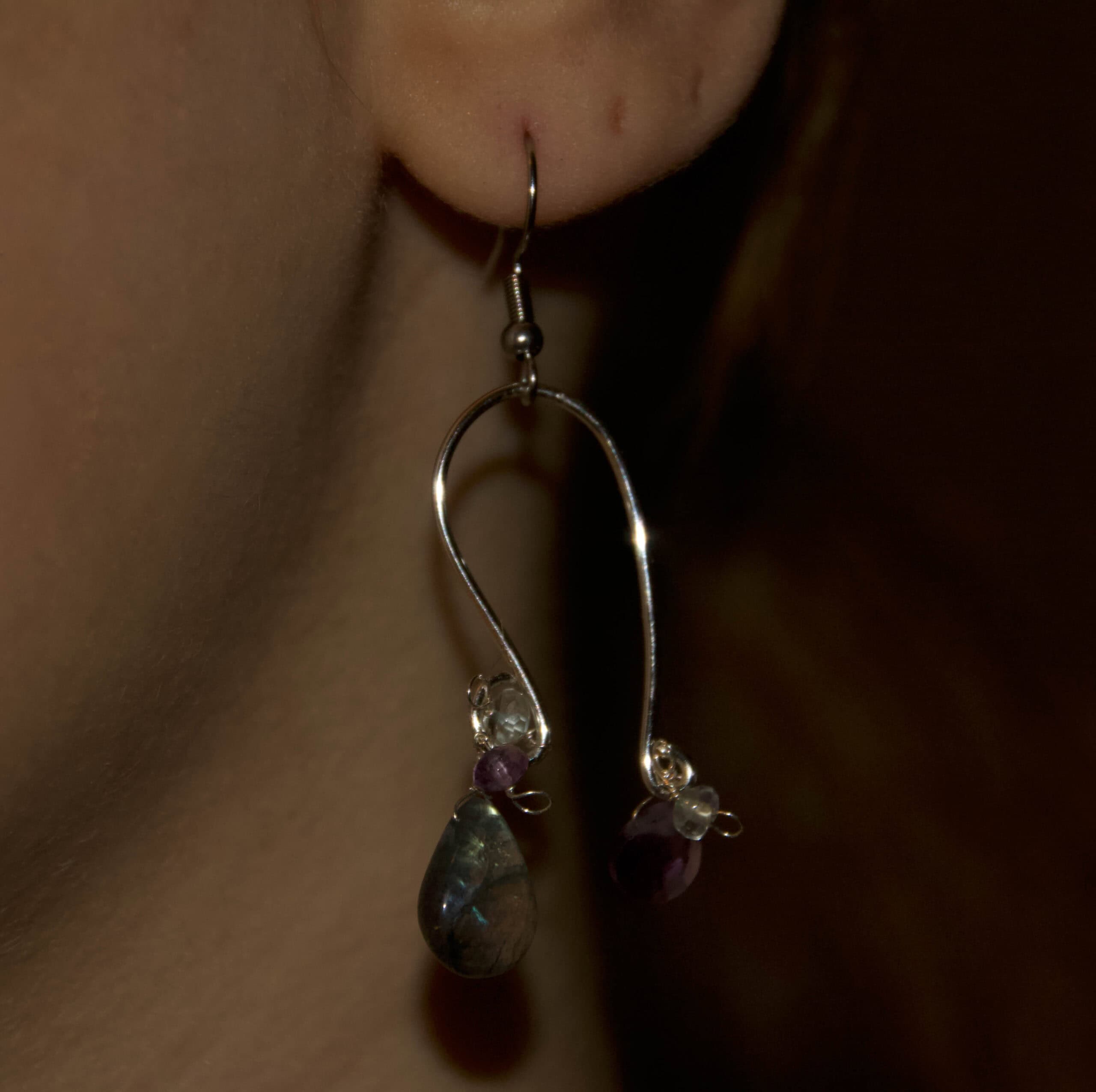 orecchino in labradorite, ametista, quarzo ialino