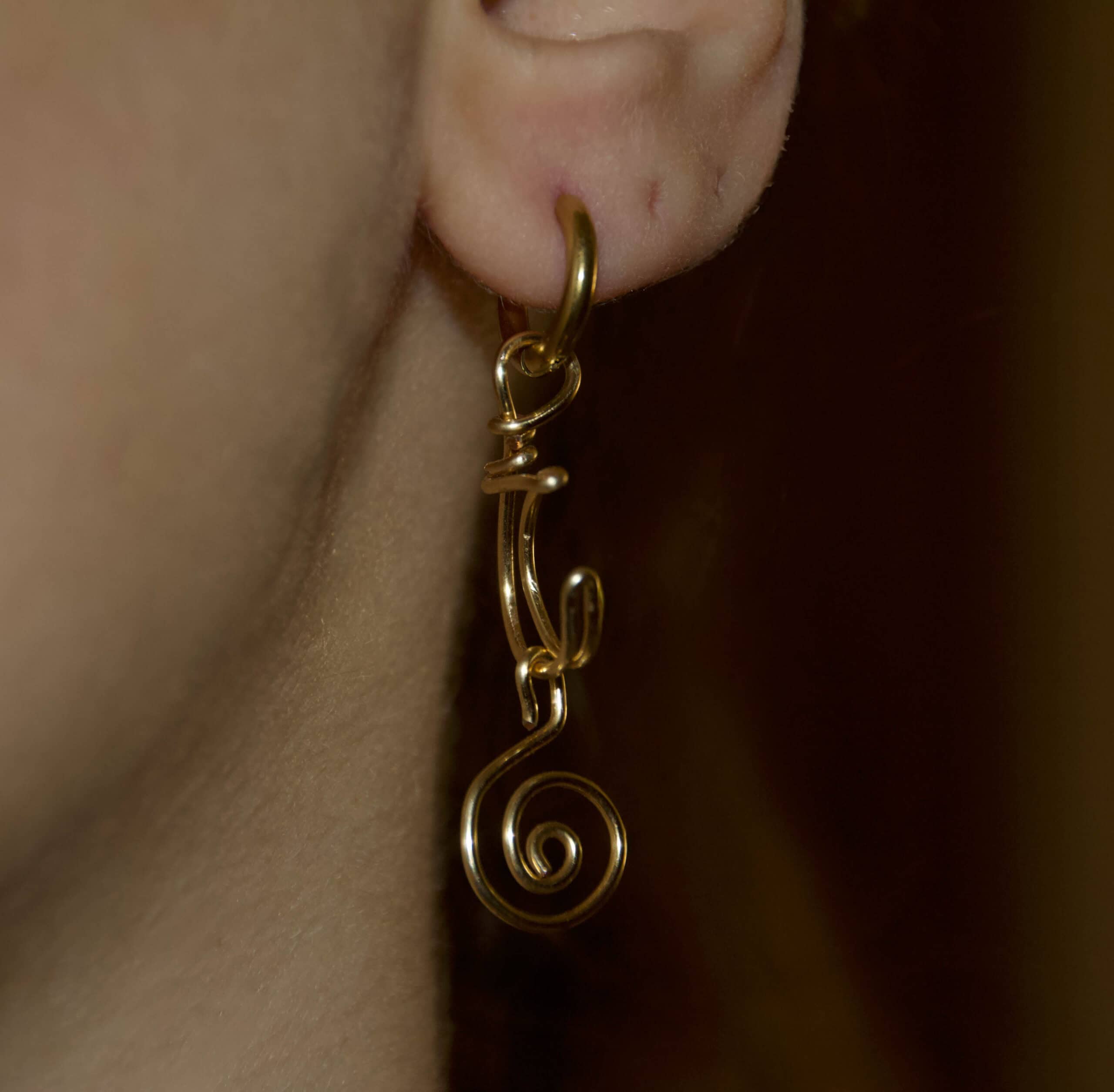 Questi orecchini sono interamente realizzati con filo dorato modellato a mano, creando una composizione elegante e leggera fatta di curve morbide. La parte superiore presenta una piccola mezzaluna aperta, mentre il pendente termina con una spirale armoniosa che aggiunge movimento e carattere.