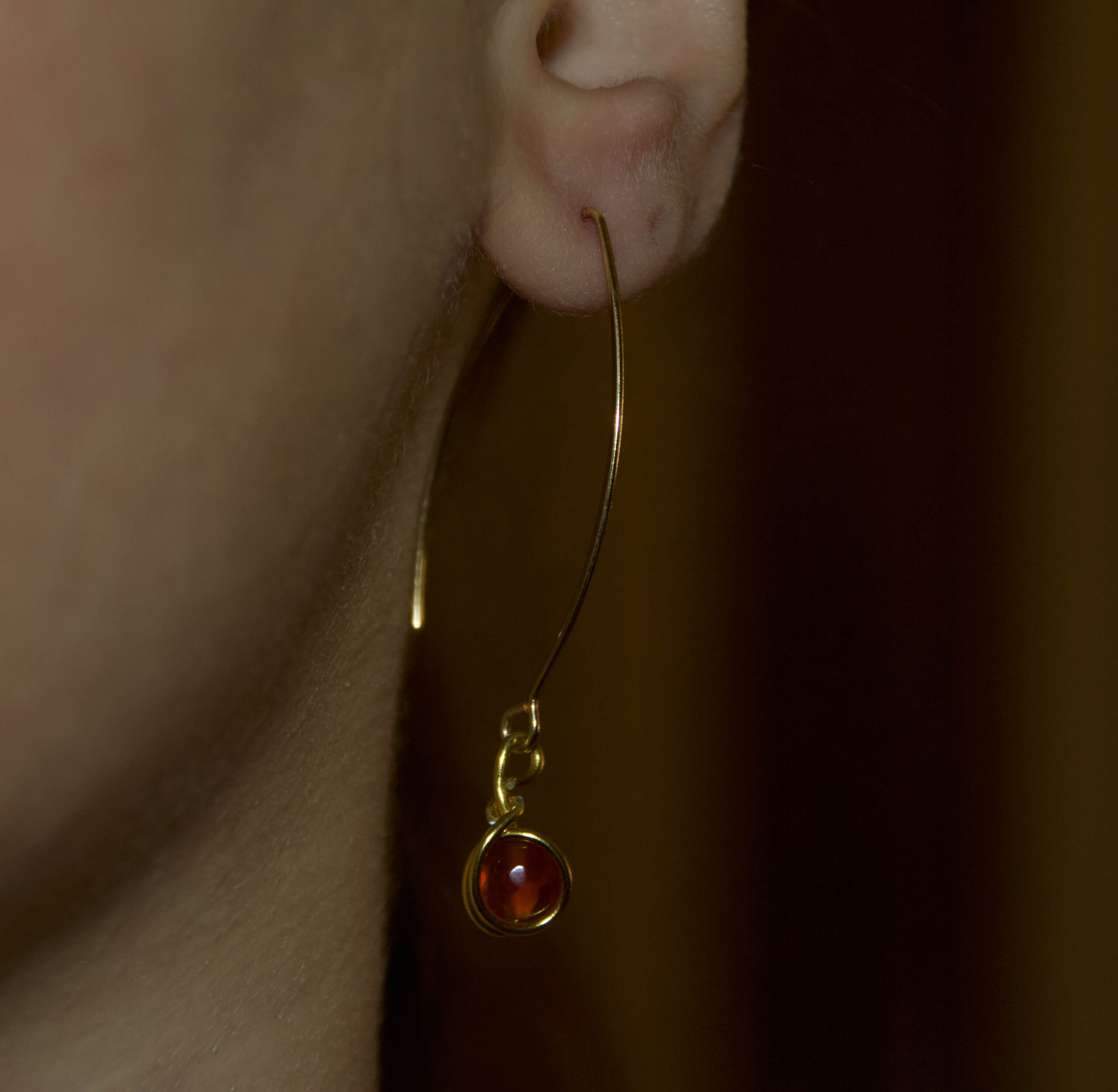 Questi orecchini valorizzano la corniola in una delle sue forme più delicate: una sfera liscia e luminosa, dal colore rosso aranciato profondo. Il cabochon è incastonato in una montatura dorata essenziale, che lo avvolge con una linea morbida e pulita.
