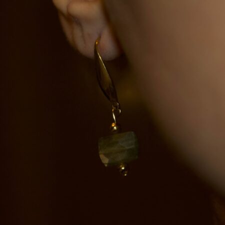 Nella parte inferiore, una goccia di labradorite cattura la luce rivelando i suoi riflessi blu-verdi tipici della pietra.