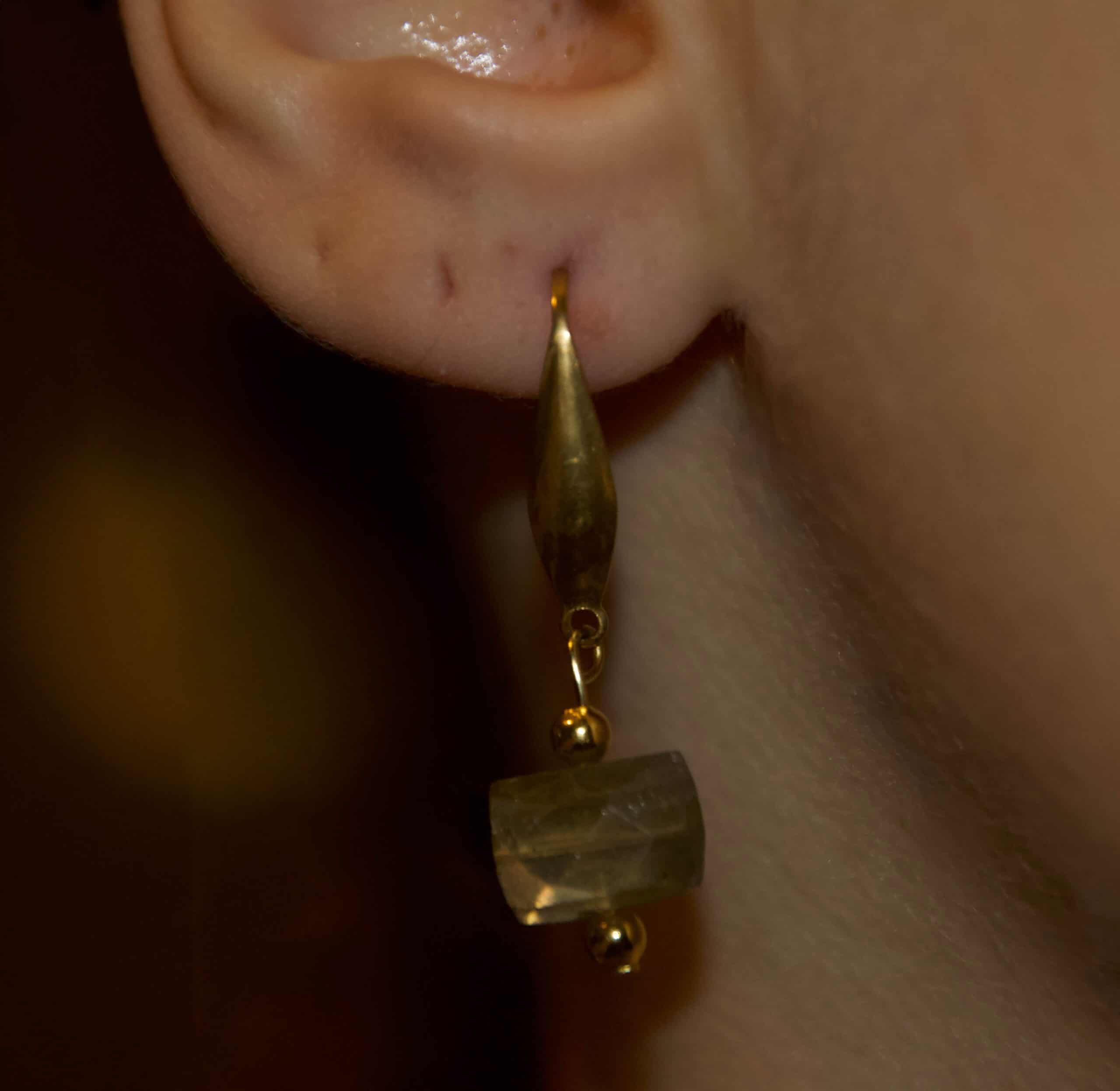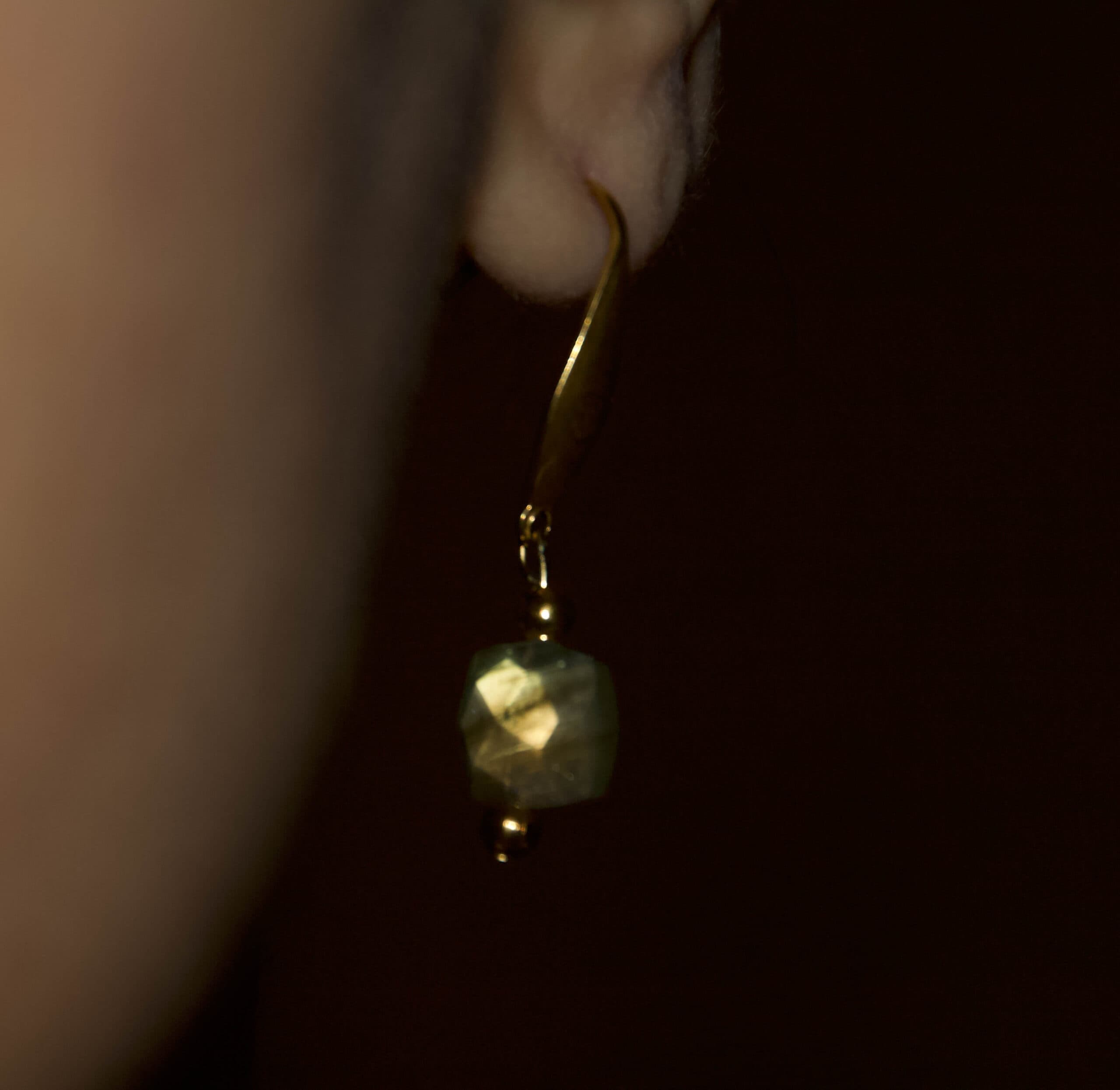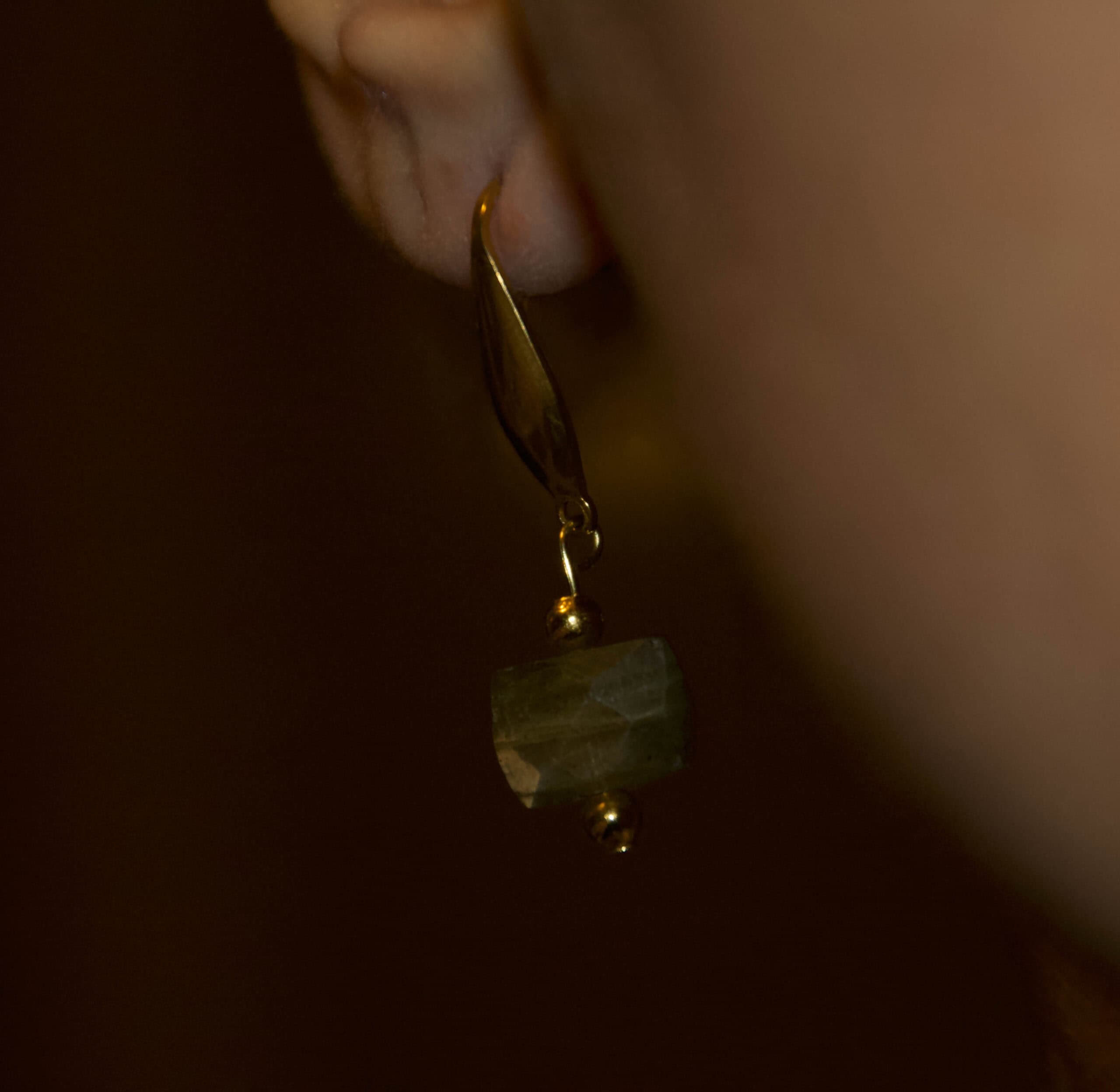 Questi orecchini mettono in risalto una labradorite naturale tagliata a cilindro, una forma meno comune che valorizza le sfaccettature e i riflessi dorati, verdi e blu tipici di questa pietra. La montatura dorata crea un contrasto elegante, aggiungendo un tocco luminoso che scalda la tonalità iridescente della labradorite.