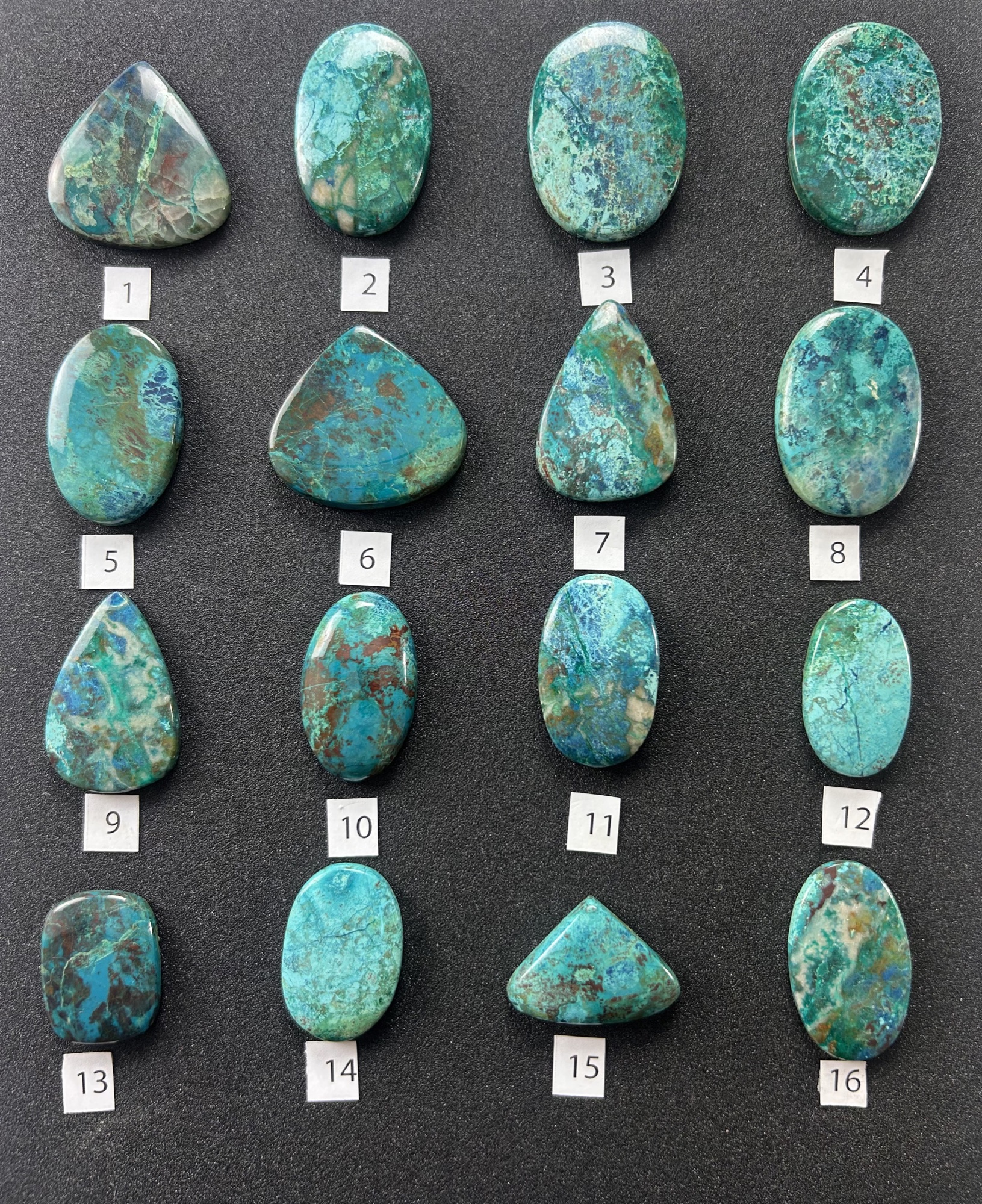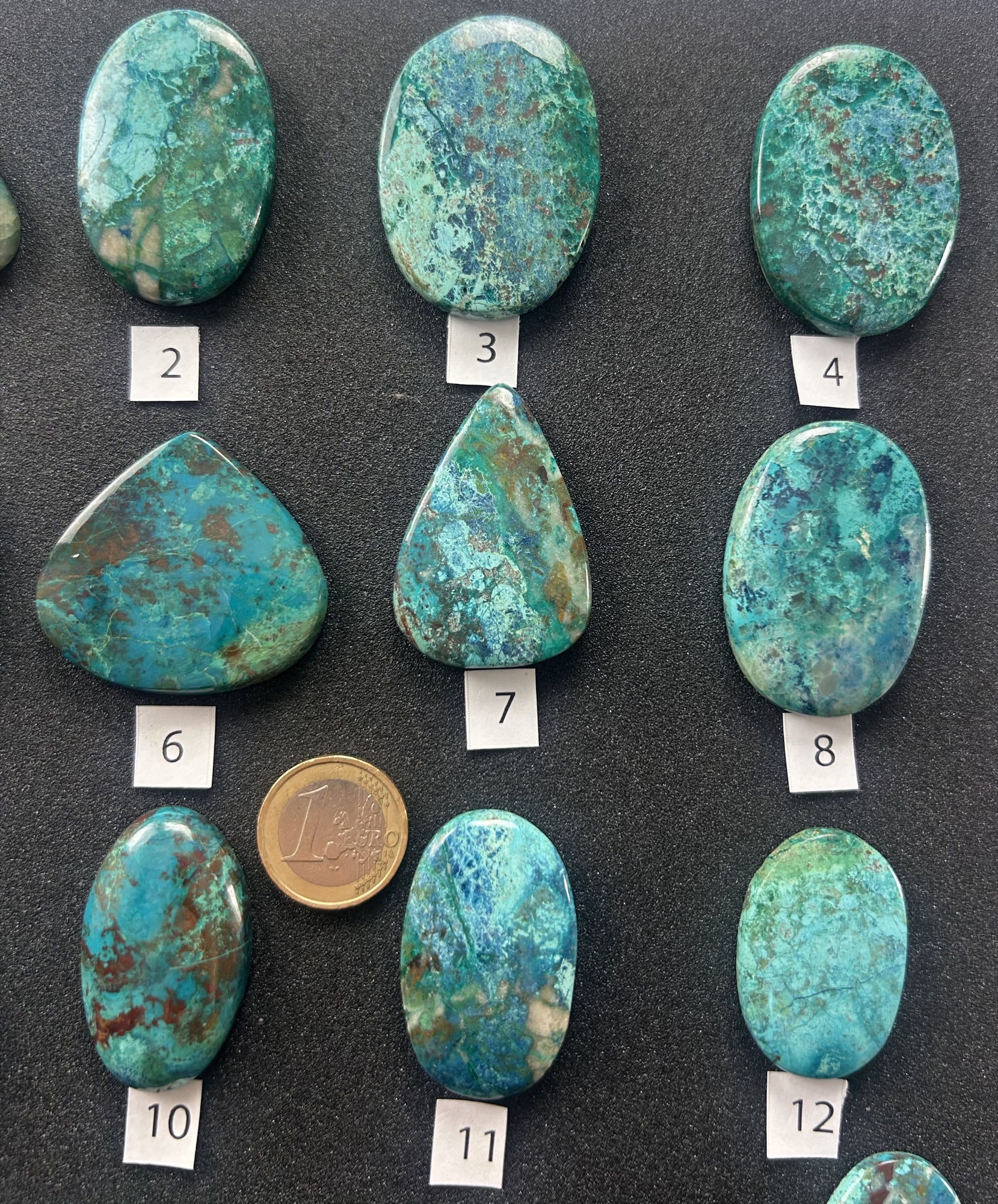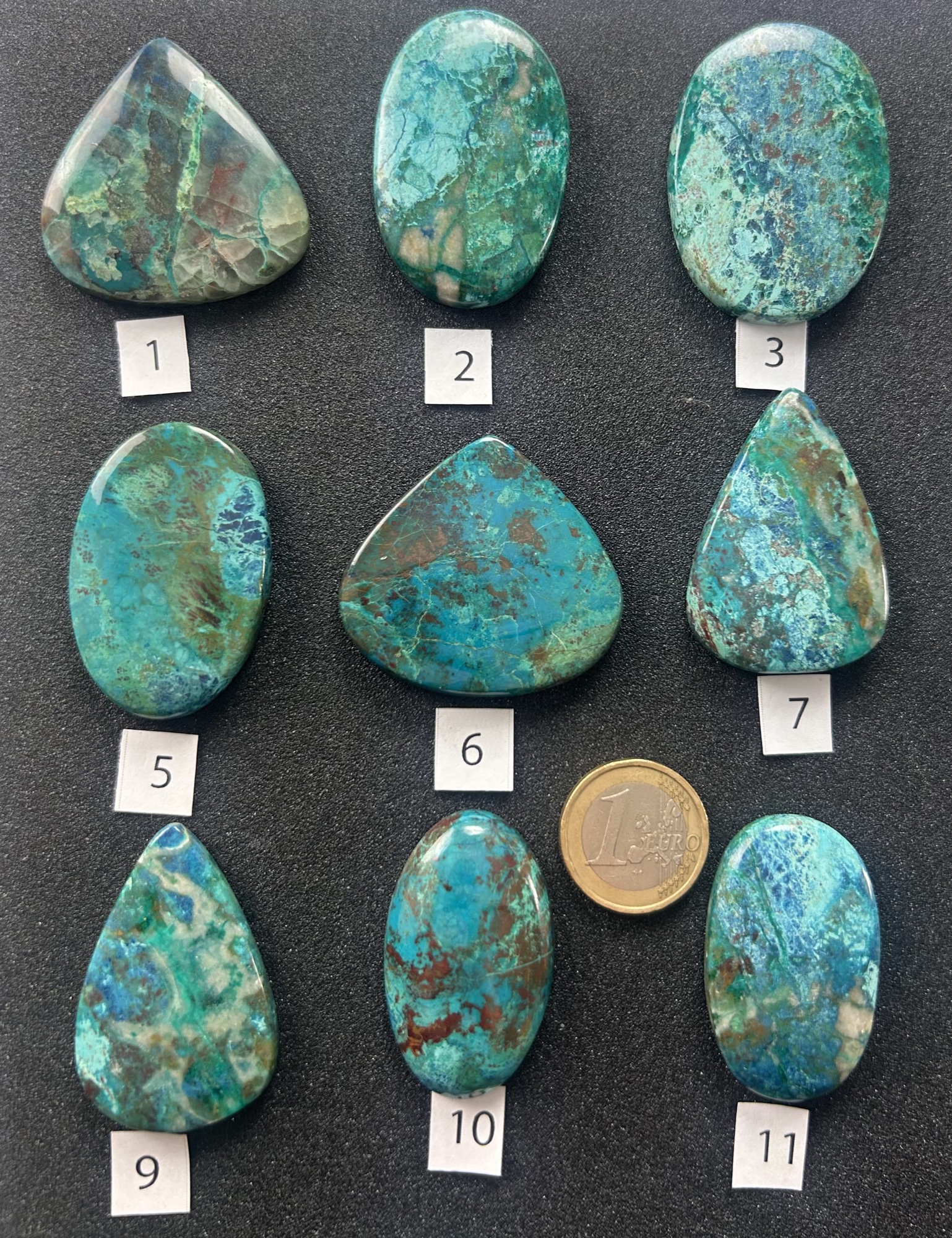 Cabochon di azzurrite-crisocolla naturale, pietra che unisce i toni blu intensi dell’azzurrite ai verdi vibranti della crisocolla. Ogni cabochon presenta una tavolozza unica di sfumature turchesi, rame e malachite, con venature e contrasti che ricordano paesaggi marini o mappe terrestri astratte. Le texture sono vive e dinamiche, con disegni naturali irripetibili.
