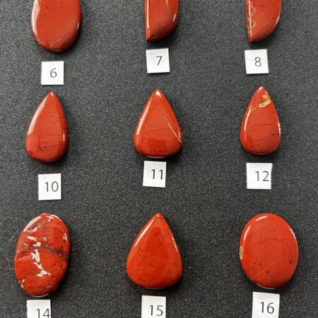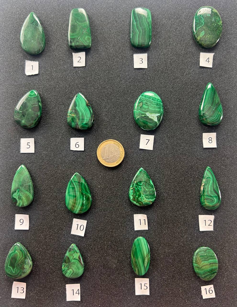 Cabochon di malachite naturale, caratterizzati da intensi toni di verde con venature ondulate e motivi concentrici naturali. Ogni pietra è unica, con disegni che spaziano da linee fluide a orbicolazioni definite, creando affascinanti paesaggi astratti di colore. Le forme comprendono gocce, ovali e rettangoli, ognuna con un equilibrio particolare tra lucentezza e profondità cromatica.