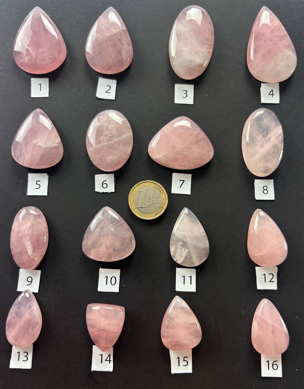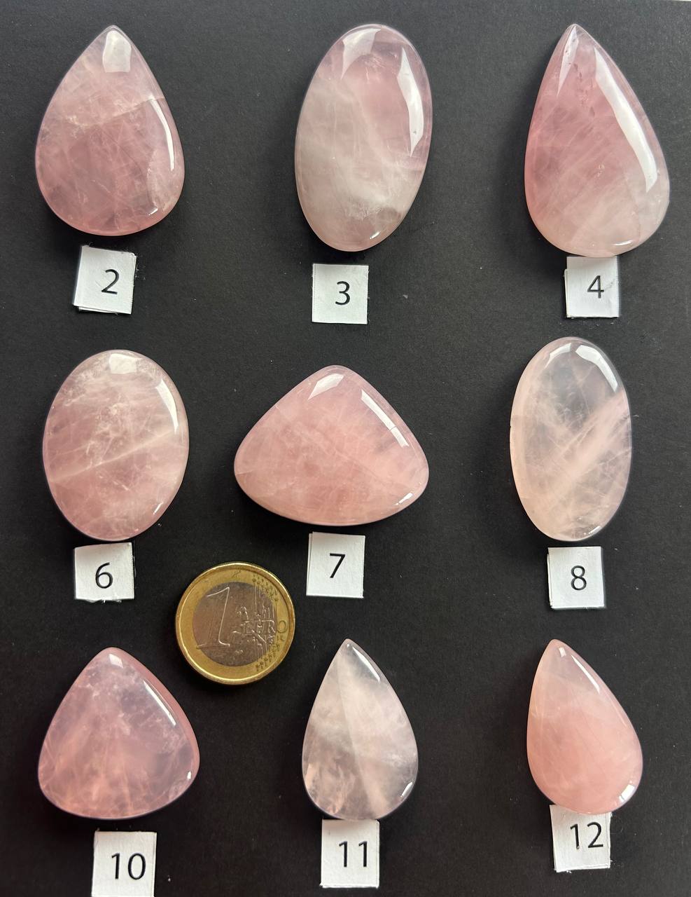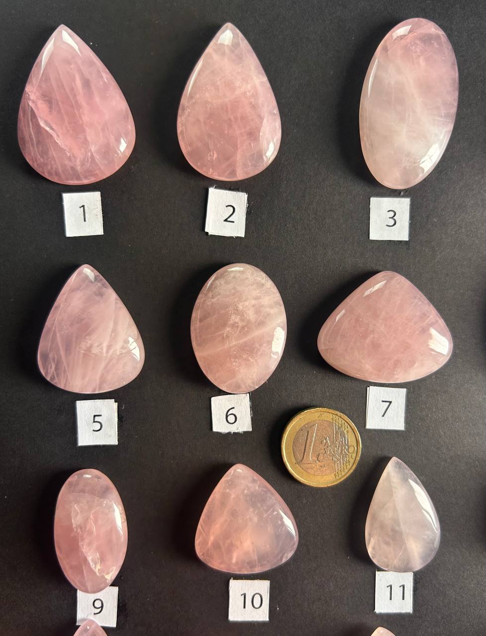 Cabochon di quarzo rosa naturale, con sfumature che variano dal rosa tenue al rosa intenso, attraversate da leggere venature traslucide che donano profondità e dolcezza al colore. Ogni cabochon è unico per intensità e trasparenza, con forme armoniose e una luminosità delicata e avvolgente.