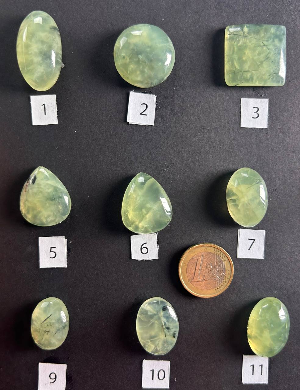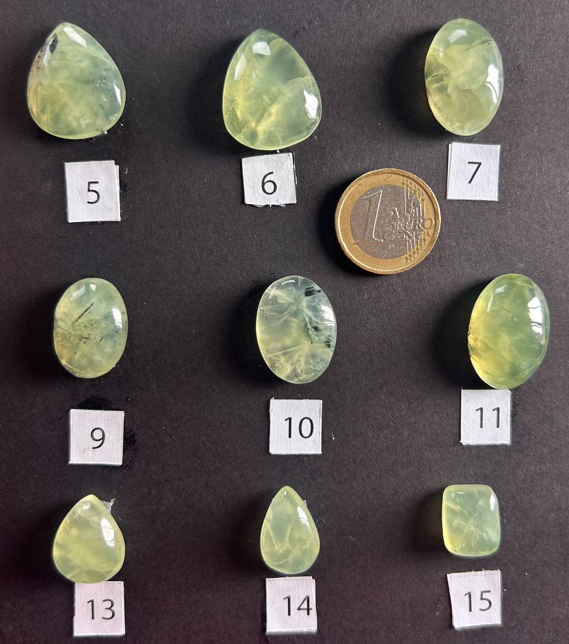 Cabochon di prehnite naturale, caratterizzati da un verde chiaro luminoso con sfumature giallo-verdi e occasionali inclusioni di epidoto che creano affascinanti trame interne. Ogni pietra è semi-trasparente, con una lucentezza morbida e un aspetto vitreo che lascia filtrare la luce, esaltando i giochi di colore e profondità.