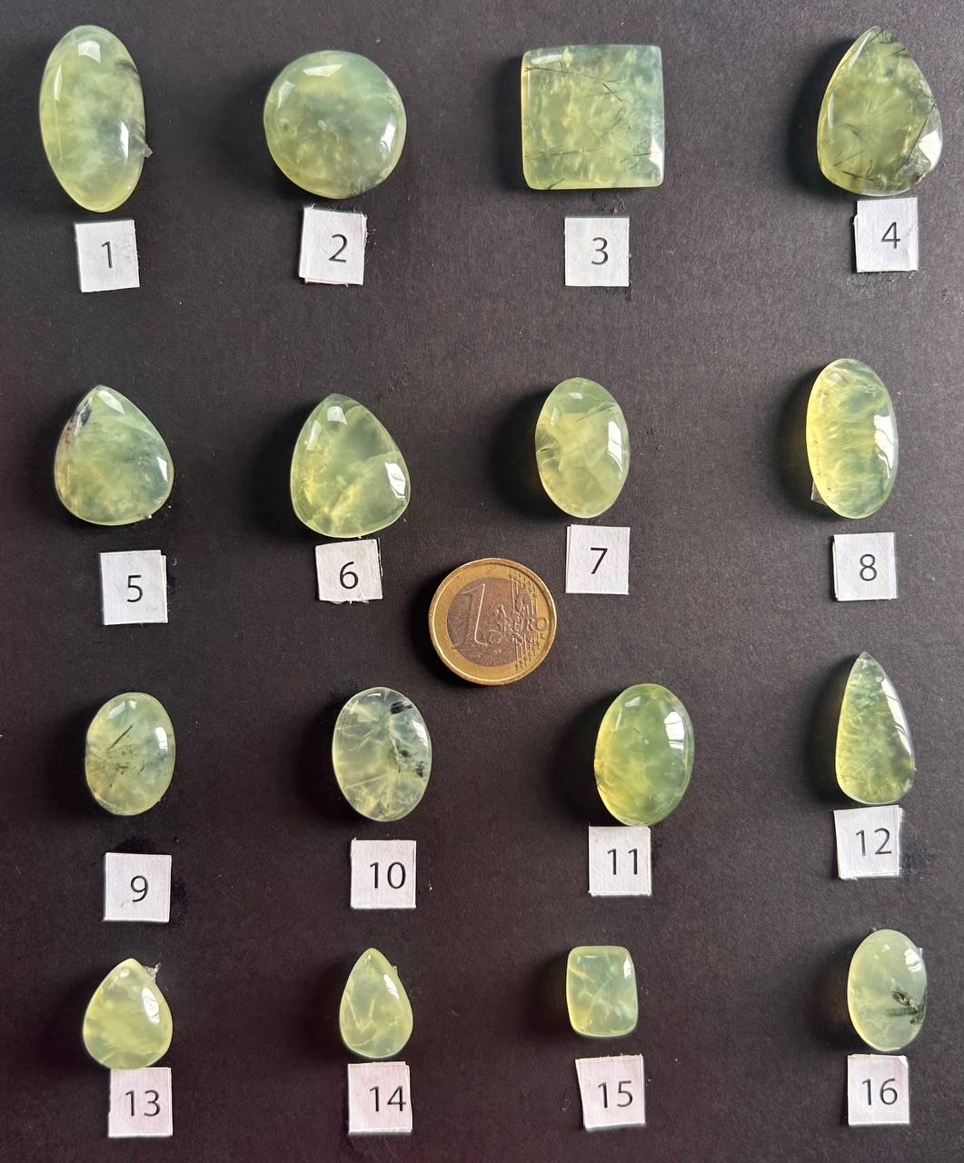 Ogni cabochon è numerato (#1–#16) e può essere acquistato singolarmente selezionando il numero corrispondente.