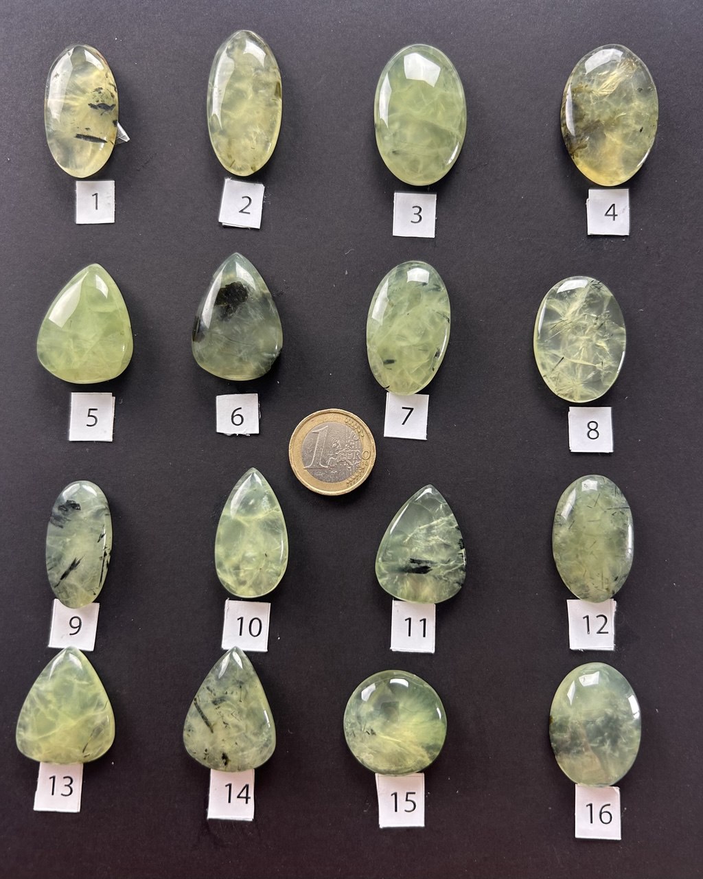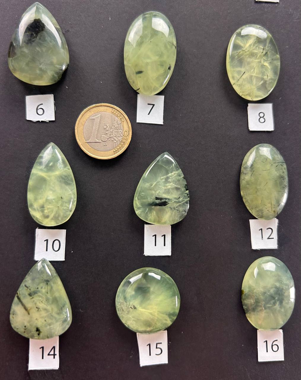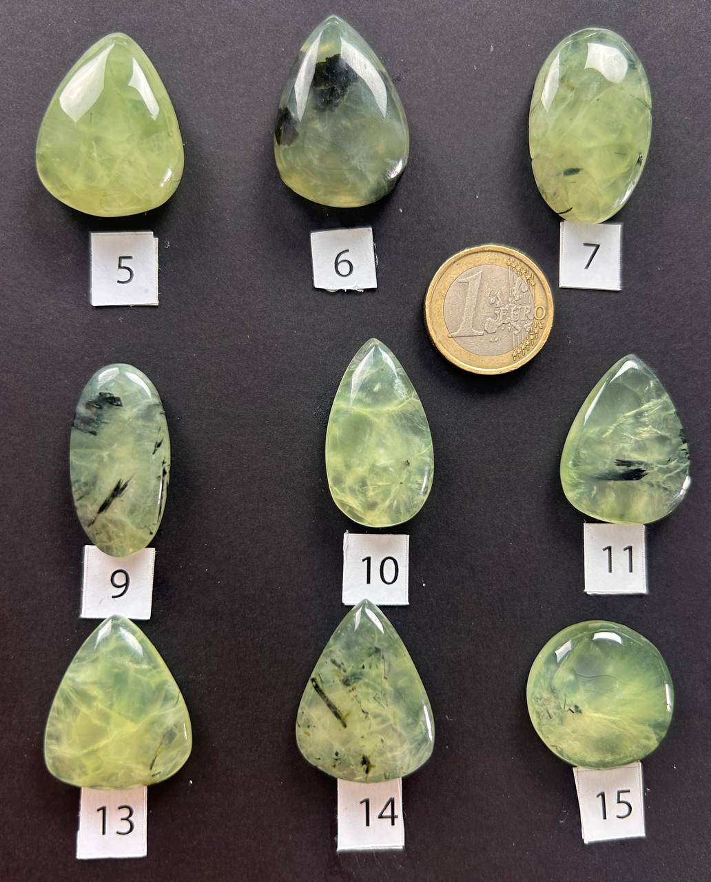 Cabochon di prehnite naturale, con tonalità che spaziano dal verde chiaro al verde-giallo traslucido, arricchite da eleganti inclusioni di epidoto nero o grigio che creano venature e giochi di profondità unici. Alcuni esemplari presentano un aspetto lattiginoso e delicato, altri una trasparenza più vivida e cristallina.