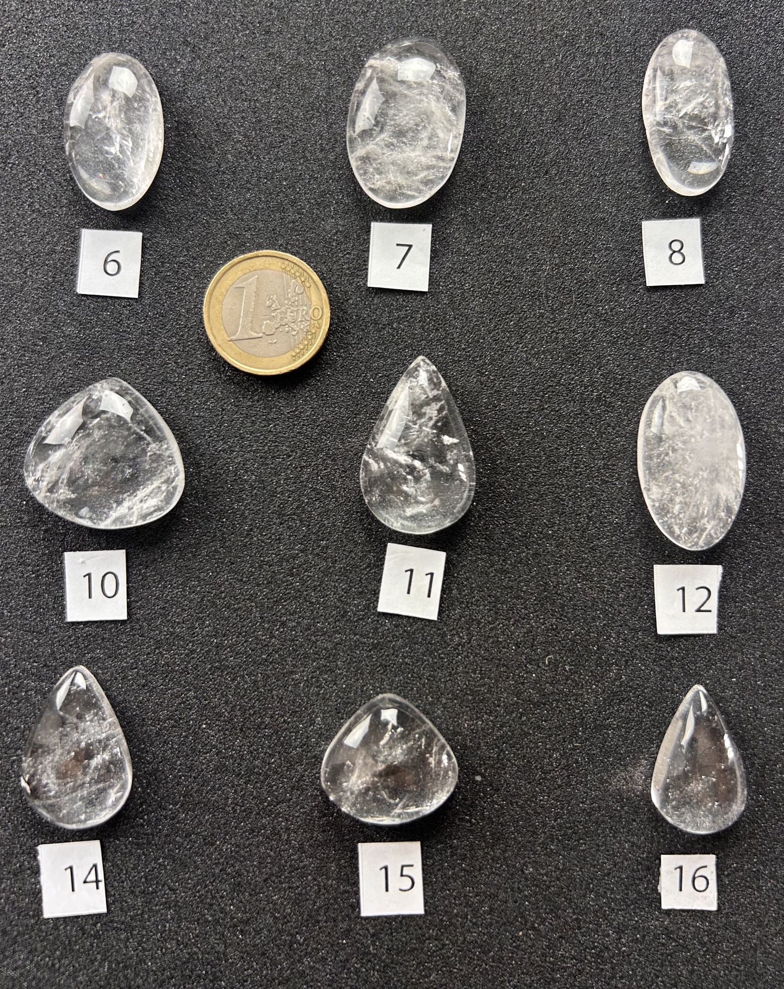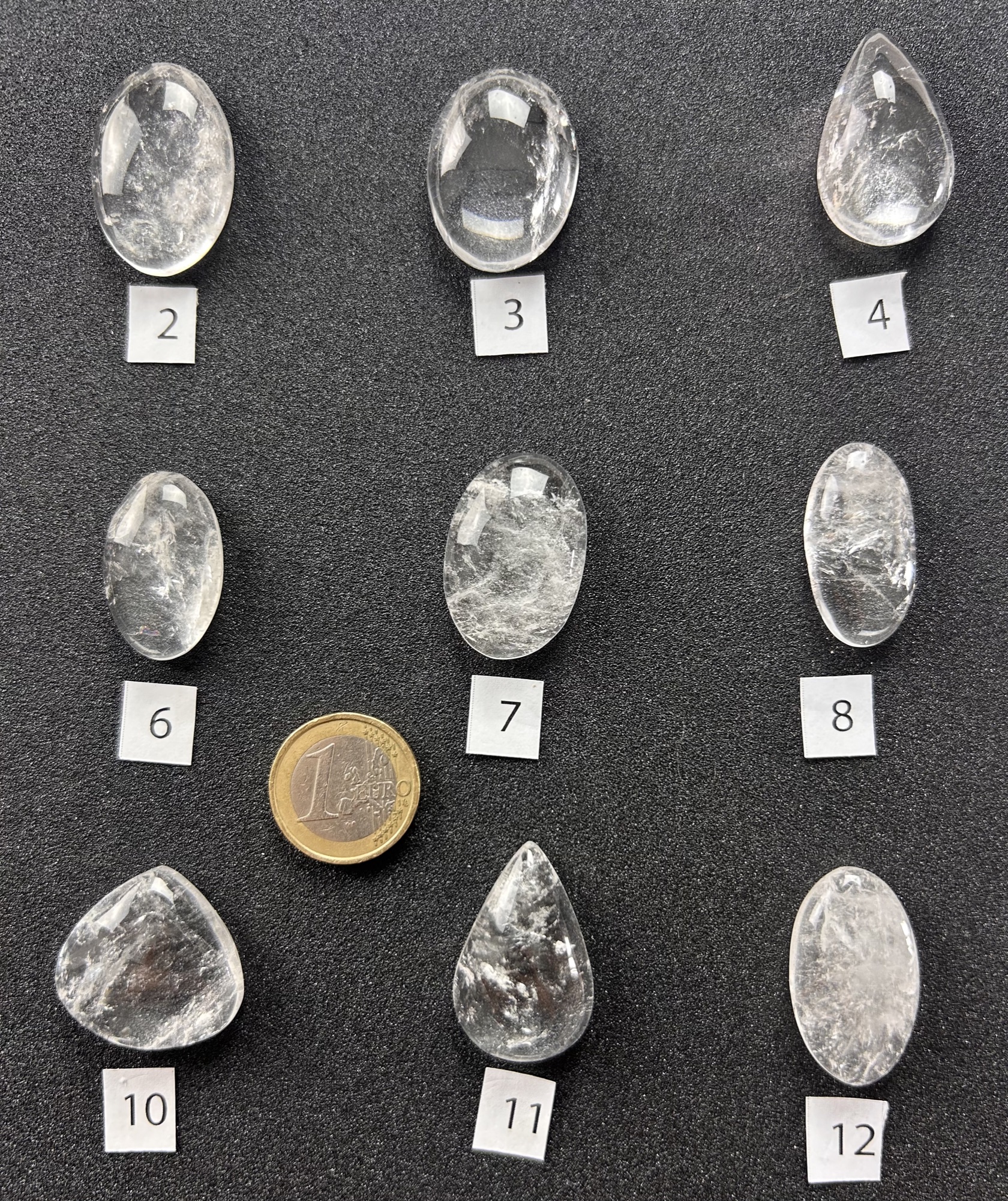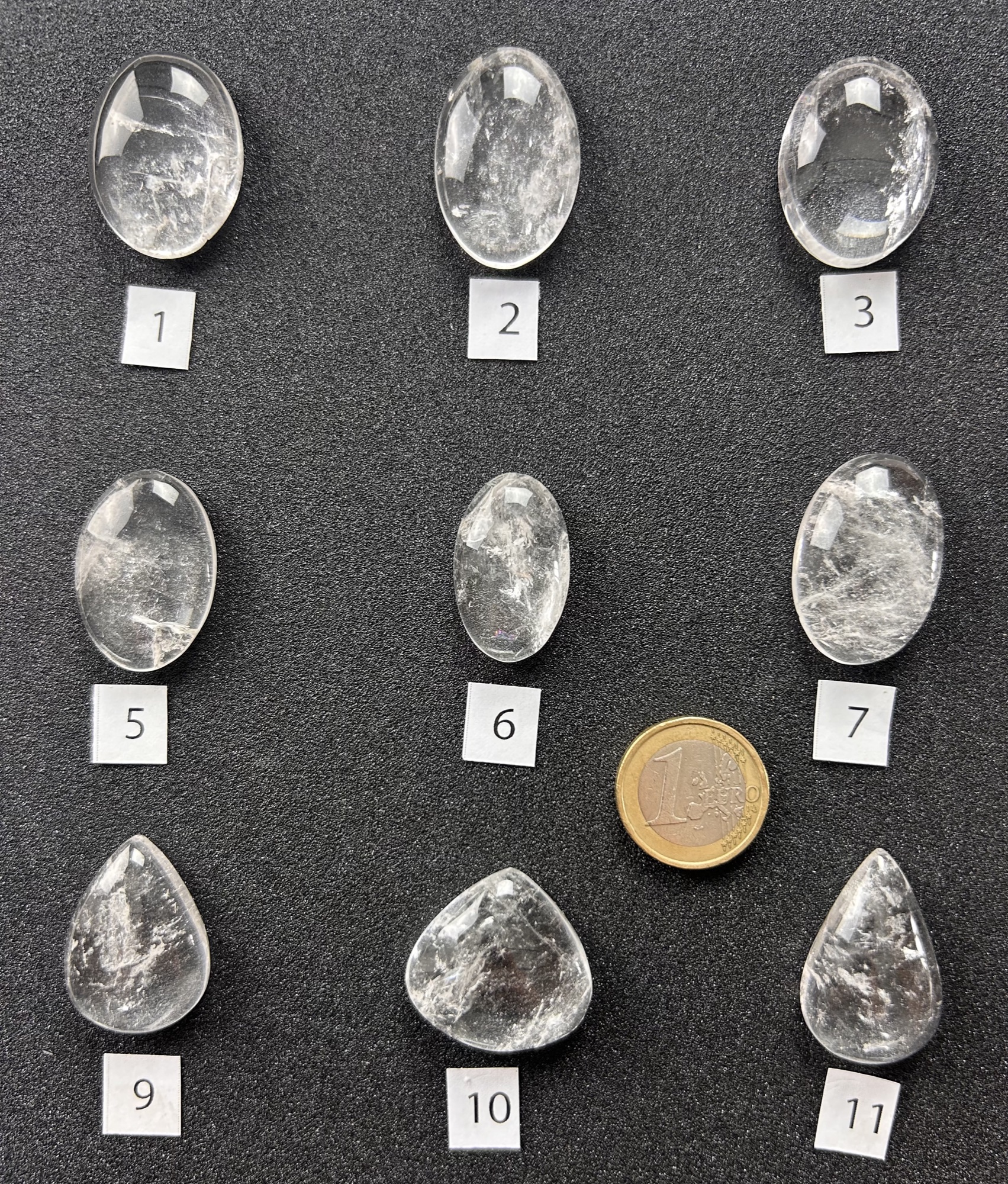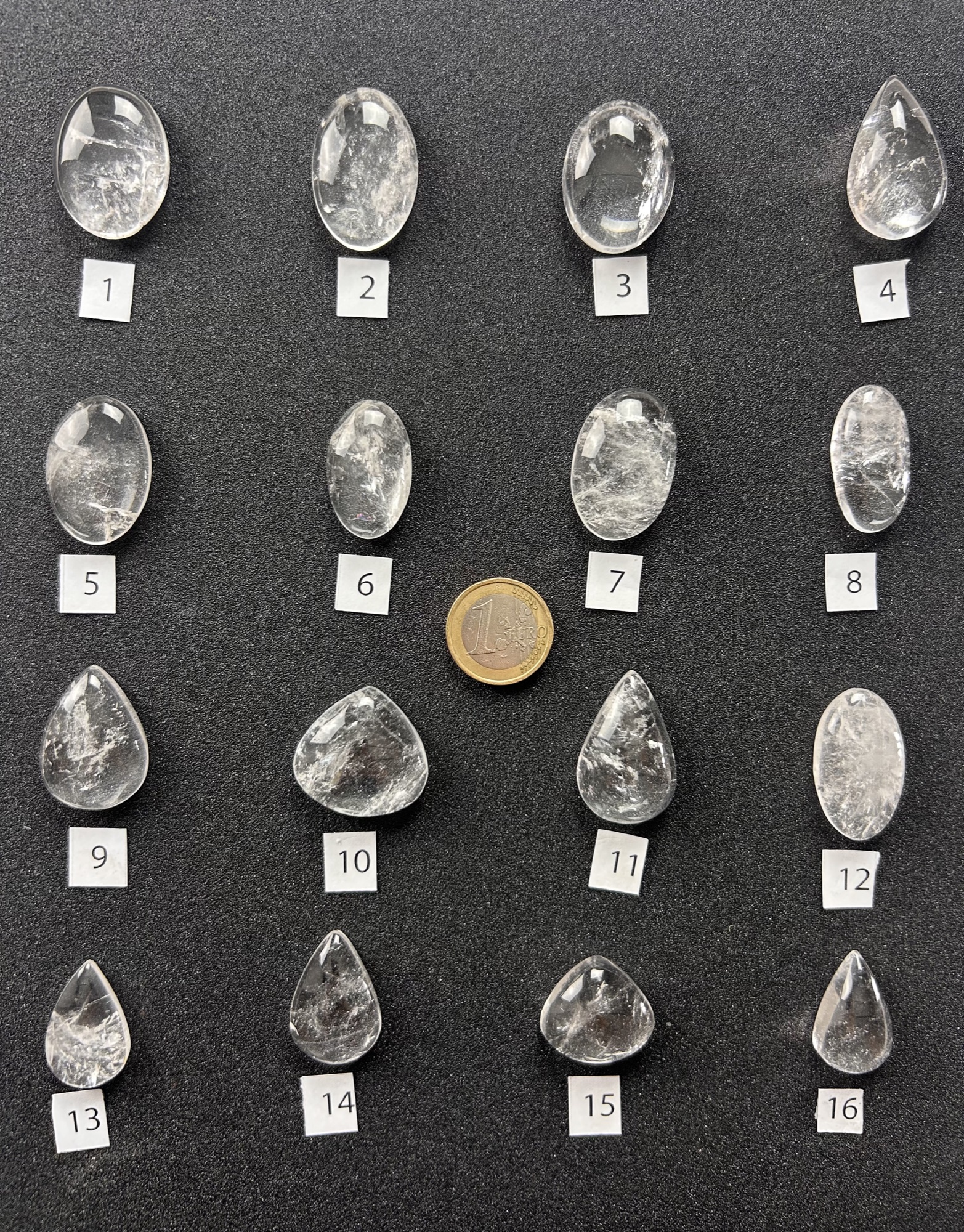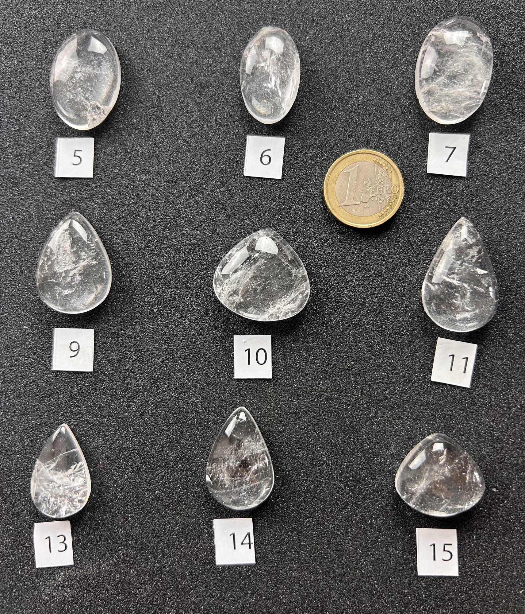 Cabochon di quarzo ialino naturale, selezionati per la loro trasparenza e per le affascinanti inclusioni interne che catturano e riflettono la luce. Ogni pietra presenta giochi ottici unici: da quelle completamente limpide a quelle con leggere “nuvole” o filamenti interni che creano profondità e movimento.